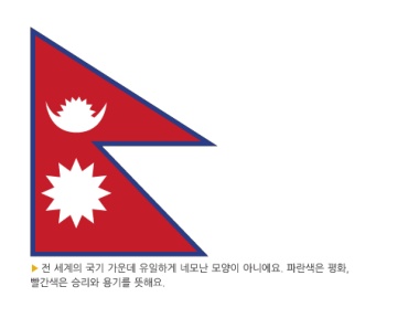 ▶전 세계의 국기 가운데 유일하게 네모난 모양이 아니에요. 파란색은 평화, 빨간색은 승리와 용기를 뜻해요. 2025. 8. 20. 오후 6:04 국기본문(2-1) 아시아 유럽 5쇄(250820)수정.indd 18 국기본문(2-1) 아시아 유럽 5쇄(250820)수정.indd 18 2025. 8. 20. 오후 6:04