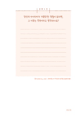 성 장 노 트 당신의 아이디어가 거절당한 경험이 있다면, 그 이유는 무엇이라고 생각하나요? ‘@marketing_note’, ‘#마케팅노트’로 당신의 생각을 공유해 주세요. 책1.indb 23 2025. 10. 29. 오후 2:56